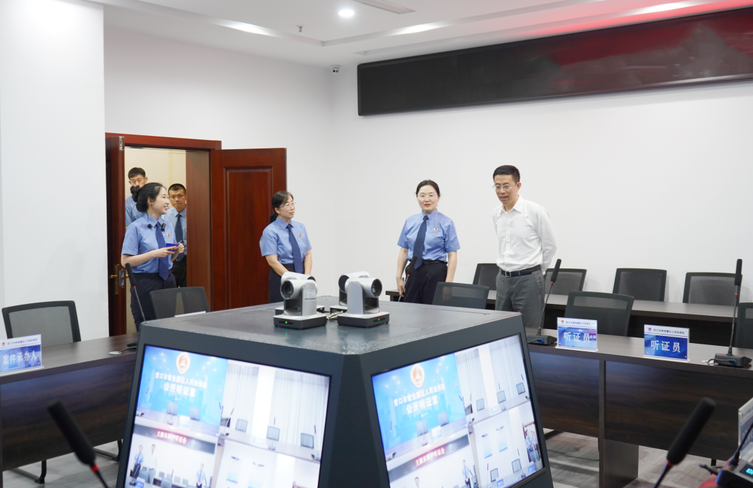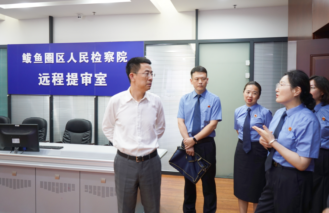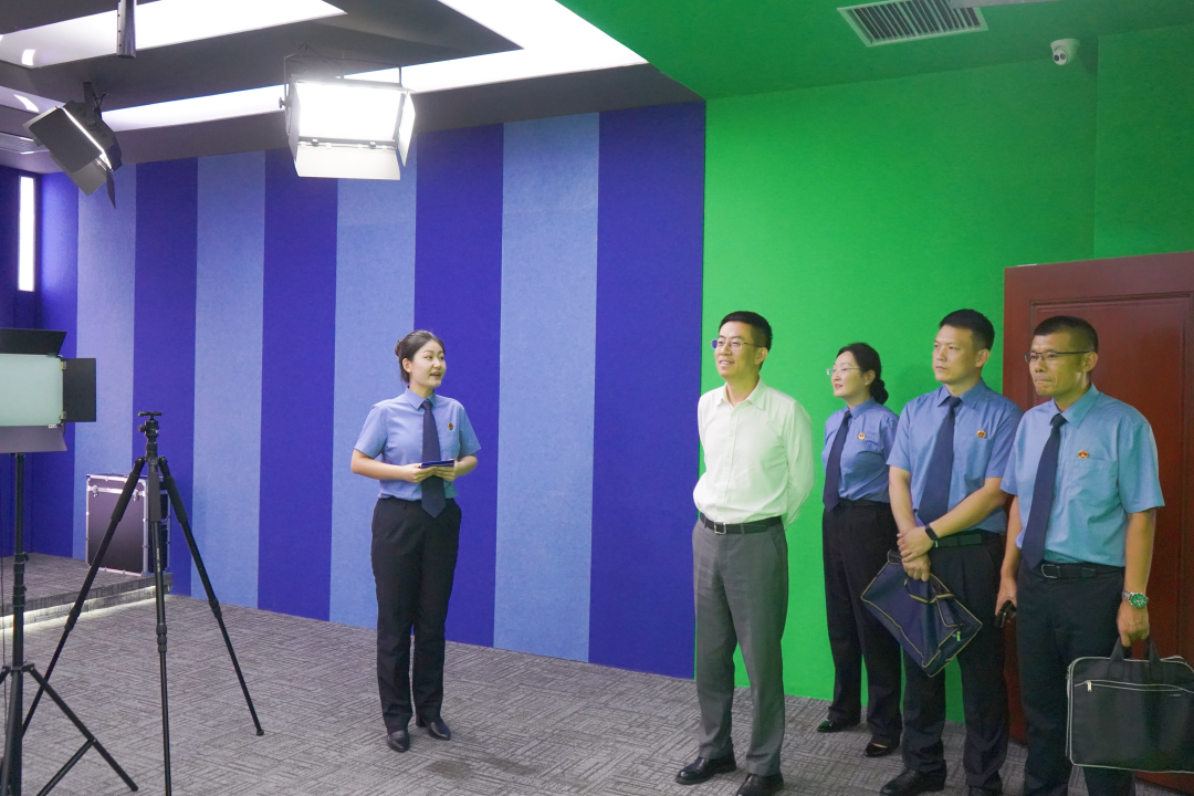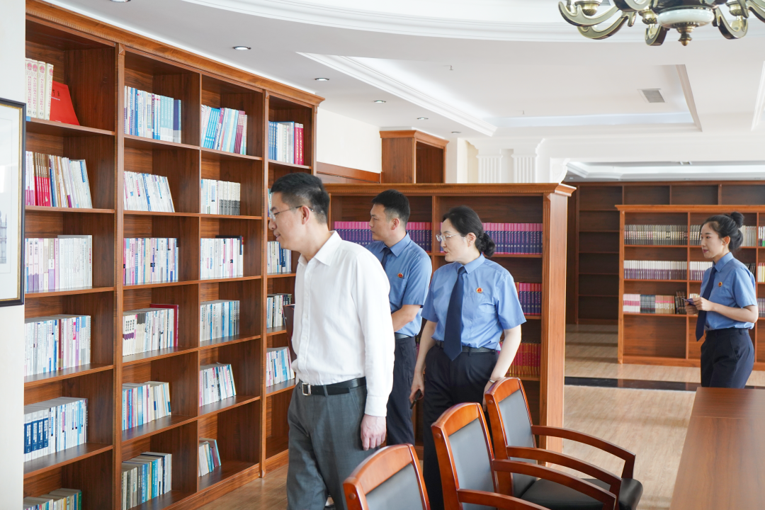 潘晓意检察长一行实地调研了案管大厅、12309检察服务中心、小螺号工作室、远程提审室、新媒体演播室等办公场所,又参观了党建活动室、图书馆、思辩室、翰墨轩等检察文化活动场所,了解我院干警工作、生活环境及基本情况。